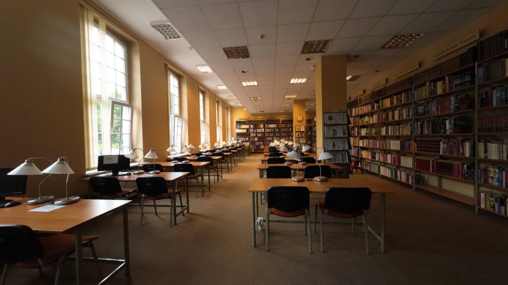 図書館ではStefan Żeromskiという人物の紹介が多くなされていた。Żeromskiはポーランドの作家・劇作家で,作品のひとつ『灰』はアンジェイ・ワイダによって映画化されている。階段の壁には作品や生家などがポスターで紹介されていた。図書館の入口前では著作や関連する本が展示ケースに入れられていた。この展示は,2025年のPatron of the Yearと関連している。Patron of the Yearとは,毎年ポーランドの国会がその年に顕彰すべき人物を複数人選出するもので,図書館や文化機関などでは,年間を通じて顕彰する。歴史的人物や作家などが選ばれている。2025年はŻeromski氏の没後100年にあたるため選ばれたようである。顕彰の方法は図書館によって異なる。『Biblioteka Publiczna』という雑誌では,著作やプロフィールの展示,外部ゲストによる講演会,作品の読み聞かせ,映画会,パトロンをテーマにした脱出ゲームなどを提案している8。国に貢献した人物を称え,その功績を未来へと伝えることを目的としている。