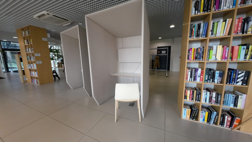 ソポトは,ポーランド北部のポモージュ県にある自治体で,人口は約4万人である。観光都市でもある。少し歩くと,グダニスク湾,そしてバルト海が見える海岸がある。市内には図書館が7館ある。蔵書は全体で約16万点,年間の来館者は累計8万人,イベント参加者は1万人である。行ったのは2015年に開館したソポト駅の駅舎にある分館である。図書館は駅舎の3階に入っており,全面ガラス張りで開放感があった1。窓際には絵画も飾られていておしゃれである。ここにはなんと日本語をしゃべれる図書館員がいる! 韓国や台湾では,日本語がしゃべれる図書館員に会ったが,ポーランドで会ったのは初めてである。図書館は,日本の図書館に似ていて,開放的である。ポーランドでよく見るような部屋に分かれているわけではない。館内には,比較的多くの利用者が滞在している。ワルシャワであまり見ない光景である。ポーランドでは公共図書館に滞在する習慣がないのかとも思ったが,そうではなく,条件がそろえば,市民は図書館に滞在することが分かる。テーブル席では,友人と勉強している人,PCで作業している人,一人で本を読んでいる人,ボーとしている人など,さまざまである。ちなみに図書館は試験勉強の利用を歓迎している。児童コーナーにはディスプレイがある。その近くには,ゲームのソフトが置かれていた。図書館員に聞くと,PlayStationがあり,館内で利用できるとのことだった。奥にはホールのようなスペースもある。ここもカーテンはあるが壁などで仕切っていない。日本のマンガが多い。また,「Meetings with Japan」と題されたプログラムも定期的に開催されている。訪問した月には百人一首講座が予定されていた。興味深かったのは,個人用ブースである。一人用のブースになっており,集中して作業できるようになっていた(下の写真)。図書館では,コワーキングスペースとしての活用を歓迎している。集中してPC作業をしたい人にとってありがたい空間である。特に,タッチ音などは日本でも問題になることがある。とはいえ,館内は適度にざわざわ感があるので,ここでは自分の出す音にそれほど気を遣わなくてもよいかもしれない。カウンターでの話し声や,資料を棚に戻す音,貸出時の「ピッ」という音などが,一番奥のホールまで聞こえる。こうしたざわざわ館が,居心地のよい空間づくりに貢献しているような気もした。図書館で実施するプログラムを調べてみると,さまざま活動していることが分かる。読書会,短編映画の鑑賞会,ボードゲームイベント,絵画教室などなど。新しい図書館ではあるが,館内に図書館員の手が行き届いており,いろいろな工夫が凝らされていた。