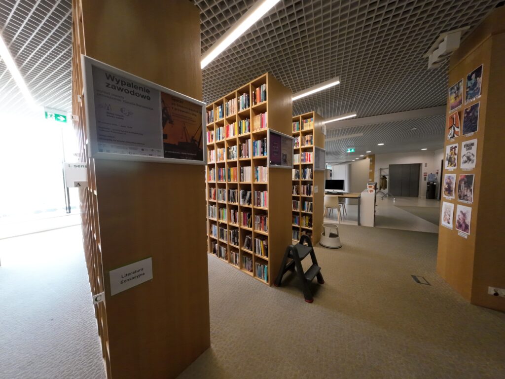 訪問したのは平日の午後である。この図書館は集合住宅の中にある。図書館に入るのが難しい。そもそも集合住宅の,どの入口から入ればよいのかも分からない。どうやら,ここが入口だということが分かったが,そこには鍵がかかっている。どういうわけかと思っていると,機械で番号を押しロックを解除しなければならない。その説明がポーランド語で書かれているので苦労した。この日の開館時間は14時半までであった。日本ではこうした早い時間の閉館はあまりないが,こちらでは予算の関係か,そうした図書館を見かける。図書室は3部屋あり,職員は一人であった。利用者はいなかった。女性がいた部屋は主に歴史関連の蔵書が並んでいた。もうひと部屋あり,そこには文学の図書が所狭しと並んでいた。全体として,この図書館の蔵書は文学書と歴史書が中心で,この2ジャンルで大半を占めていた。奥には閲覧室もあった。全体に,ワルシャワでよく見るタイプの分館と似ていた。ここで確認できたのは,ポズナンでも,分館レベルは小規模であることと,蔵書は文学書や歴史書など人文学を中心としていることであった。