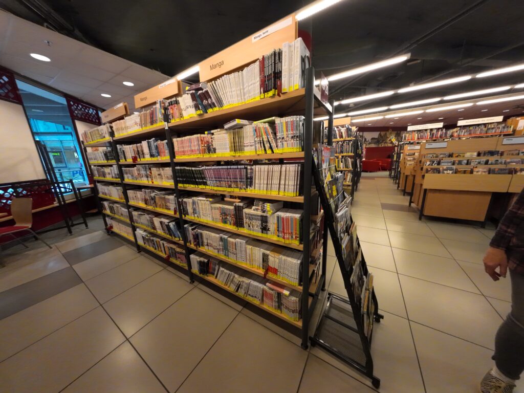 訪問時,利用者は多く,館内も貸出も,どちらも利用者で混雑していた。来館者は少し以前のデータだが1日1,200人から1,300人である2。利用者は若者が多く,学生と思われる人が目立った。図書館の周辺にはグダニスク大学を始め高等教育機関が多くあり,学生の利用が中心であるという。以前は,大学の図書館が貧弱だったため,もっと学生の利用が多かったという。閲覧席には,ポーランド以外にルーツを持つと思われる利用者も見られた。そうした利用者にとっても居心地のよい図書館なのだろう。入口の右側が閲覧室で,席はほぼ埋まっていた。ここだけドアで区切られている。それ以外は,ちょうど直前に行ったソポトの図書館同様,基本的にワンフロアで空間を分けていない。フロアの中心に視聴覚資料があり,その周りに多くの図書が排架されている。ドラムパッドや電子ピアノなども置かれており,イヤホンをして演奏できる。そして,壁沿いに多くの閲覧席がある。ガラスの壁にはレール敷きの目隠しがあり,自分の空間を作ることができる。カウンターには3人の職員が常駐しており,その後ろには予約資料が並んでいる。カウンターの奥に児童コーナーがある。当初は子ども用の「プレイグラウンド」として位置づけられていたが,他の空間と区切られていないため,音の観点で少し問題があったとのことだった。「図書館は静かであるべき」という規範はやはりあるためである。そのため,リデザインして小さな椅子やソファなどを置き,親子で読書するスペースに変更したという。このスペースはイベントにも使われている。図書館では,かなり頻繁にワークショップや講演会を開催している。その際は,書棚を移動させ,椅子を出す。コミックコーナーもあり,日本のコミックが6つの棚分置かれていた(日本語原書のマンガもある)。かなり多い。他にもアメリカンコミックやポーランドのコミックもある。これらのコーナーは人気があるという。興味深かったのは,図書館脇にあるデッドスペースのようになっていた通路を,図書館の閲覧スペースとして活用している点である。そこは,吹き抜けとなっているため,商業施設の音がかなり聞こえる。しかし,12ほどある机はすべて埋まっていた(訪問時は平日午後)。にぎやかな場所で,会話をしながら作業したいというニーズにぴったりのようである。音があることで,逆に好まれるスペースが図書館にもある点が興味深い。