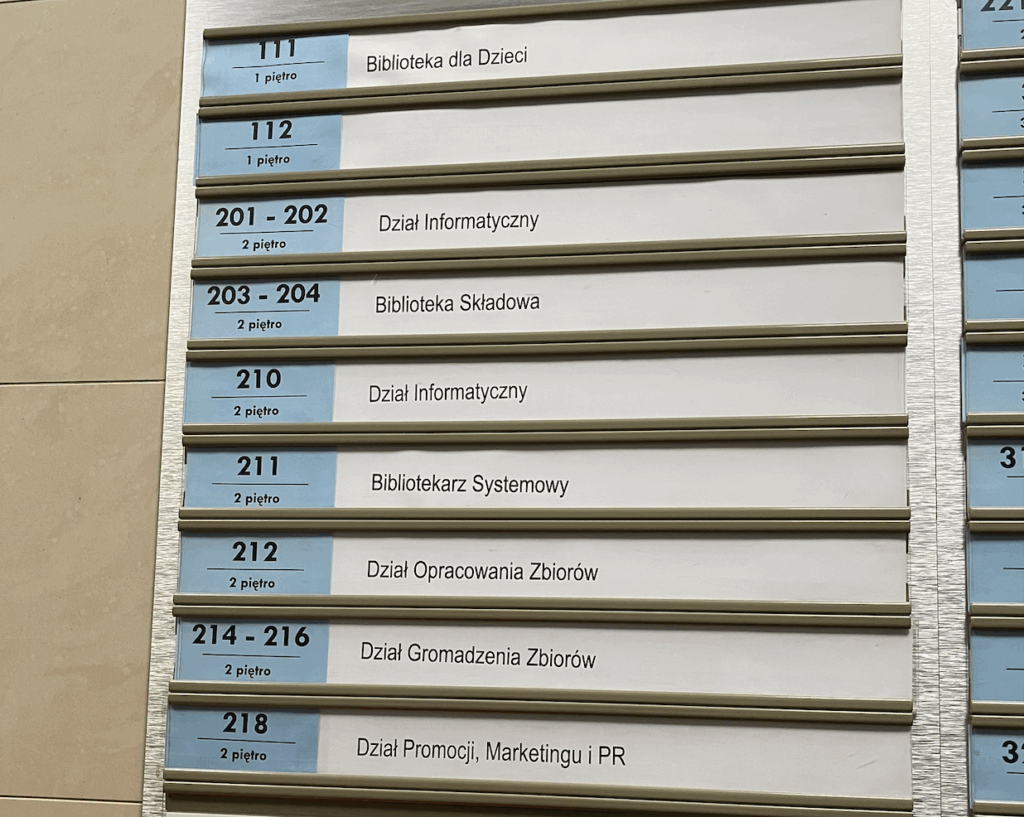 市内には本館を含めて図書館が30館ある。本館は,グダニスク中央駅からそれほど離れていない市庁舎などが並ぶ地域にある。図書館は事務部門とともに,大きなビルに入っている。事務部門は部門ごとに部屋が分かれているのが新鮮である(写真の部屋番号はその一部)。日本のような「大部屋」で仕事するスタイルとは全く異なる。日本の自治体関連の文献を読んでいると,日本の行政機関の特徴として「大部屋」という言葉が出てくるが,その意味を改めて認識できる。建物に入ると,すぐに図書展示スペースがある。15世紀のインキュナブラと思われる資料が2点展示されていた。市立図書館でこのような資料を所蔵しているのは驚きである。左側には,比較的大きな閲覧室があり,レファレンス資料などが並んでいる。ポーランドの閲覧室らしくクラシカルでおしゃれである。平日午前中だからか利用者は一人だった。1階(日本的に言えば2階)に上がると,児童図書館がある。YA向けの図書も同じスペースにある。日本の図書館と比較すると,YA向けの蔵書がかなり充実している。子ども向けの棚やソファなども工夫されている。学校訪問があり,廊下は中学生ぐらいの生徒たちで混雑していた。0階に戻り,建物の右側へ行くと,視聴覚資料の部屋と一般用の貸出室がある。貸出室には,とぎれずに利用者が来ていた。新しい図書も多く並んでいた。書棚を眺めている利用者の姿もあった。OPACを検索すると,書誌レベルで月ごとの貸出回数が棒グラフで表示されていて面白い。グダニスクの図書館では,市内の図書館の資料を予約することが可能であり(フィクション以外),さらに,トリミア都市圏であるグダニスク,ソポト,グディニャ間で相互貸借も実施している。それを超える館(たとえばワルシャワなど)からの借用も可能だが,利用は館内閲覧に限られる等の制限がある。全体として,事務部門が部門ごとに分かれた部屋で仕事をしていたのが印象に残った。このこと自体はここに限ったことではないが,県の役割を担っており事務部門も多いことから,その部屋の数の多さが印象に残った。