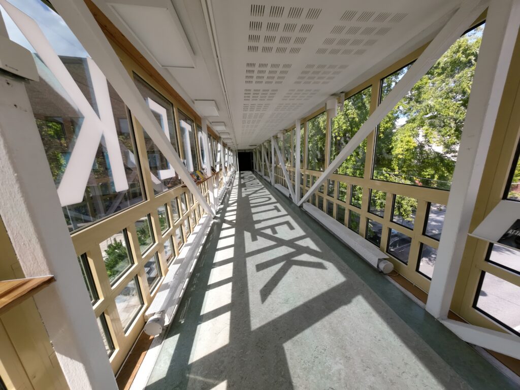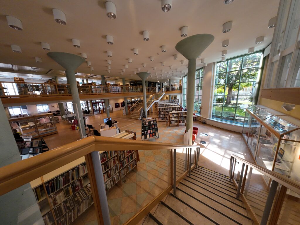 中央図書館はヴェステロース駅から徒歩10分ほどの場所にある。すぐ近くにヴェステロース大聖堂や,ギムナジウムに起源を持つ高等学校がある。大聖堂は訪問時,内部の工事中であったが,荘厳な建物であった。この図書館は1956年に教区・県立図書館として建設され,1975年に市立図書館となった2。駅から向かうと,ヴァサガータン通りをまたぐ渡り廊下が見え,そこに「bibliotek」と書かれている。左側がレンガ造りの建物で,右側が1990年に建てられた新しい建物である。左側の建物はまた,最初からある部分と後に増築された部分に分かれていて,構造はやや複雑である。建物の詳細はこちらが詳しい。