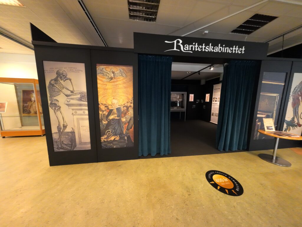 1階には2017年にできた古書展示スペースがある(ヴェステロース教区図書館)4,5。天井から音楽が流れていたり,チェインドブックの写真が鎖でつながれている。色鮮やかなインキュナブラも展示されている。この図書館のルーツは,中世に起源をもつ隣の大聖堂図書館と,1623年創設のやはりこれも隣のギムナジウム図書館である。この2つと図書館は補完的であることをシンボリックに象徴するように三角形の位置関係にあるという。コレクションには,中世以降の写本やインキュナブラ(139点),印刷本,地図,楽譜,肖像画などが含まれる。中でも,ヨハネス・ルドベキウスによるスウェーデン最初の世界地図は興味深い。世界地図を教育的意図から北と南を逆に描いており日本は左端にある。彼はスウェーデン初の印刷所をヴェステロースに設立した人物でもある。