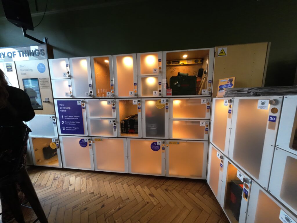 入口には盗難防止ゲートがある。その横では図書やDVDが1ポンドで売られていた。目の前にはカフェスペースもあったが,訪問時は休業中であった。左側には「LIBRARY OF THINGS」と書かれたコーナーがあり,道具類がロッカーに収納されていた。これはLibrary of Things Ltdが運営している23。北欧やドイツなどでは無料で貸出していたが,ここでは有料である。訪問時,実際に利用者が複数いた。ロッカー周辺は閲覧用スペースとして使われている。(後日,ワンズワースのショッピングモールでも同じロッカーを見た。図書館に限らず展開しているようである。)