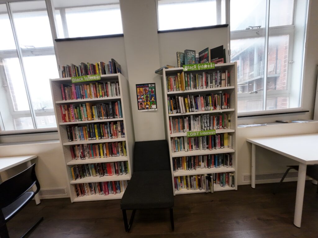 1階は通常の図書館である。カウンターがあり,その手前にはPCが4台並び,中高年の男性がYouTubeのような動画を視聴していた。横には自動貸出機,予約資料,新刊図書,返却本の棚が並んでいる。奥に行くと文学書や一般書があり,地域資料(local history)のコーナーもあった。図書はランベス区の蔵書で,システム(ILS)もランベス区のものを使っている。左奥は児童コーナー,右奥は青少年コーナーであり,それぞれ利用者がいた。日本のコミックも少し置かれている。『ONE PIECE』などが目についた。特徴的だったのは,「Black Interest」や「LGBT Interest」などの常設コーナーがあったことである。それぞれ規模は1~2棚程度であったが,特にBlack Interestは他国では見られなかったものである。