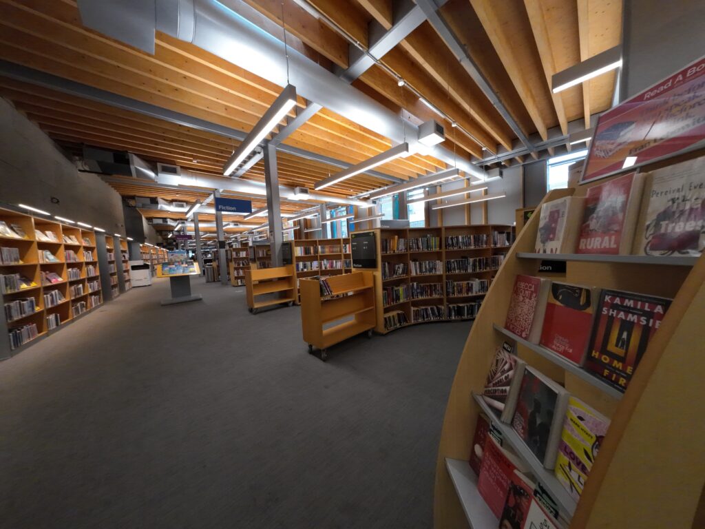 当時の建築写真を見せてもらったが,装飾はほとんどなく質素で簡潔な空間が印象的である。入口を入ると,コミュニティ掲示板とともに,図書館からのお知らせなどが多く掲示されている。オンラインオーディオブックの案内や,市民権取得のためのオンライン講座の広報などが掲示されていた。その先には小さな一人用カウンターがあり,横には自動貸出機がいくつか並んでいる。延滞料金は従来現金での支払いもできたが,今年から電子決済のみとなった旨が記されていた。