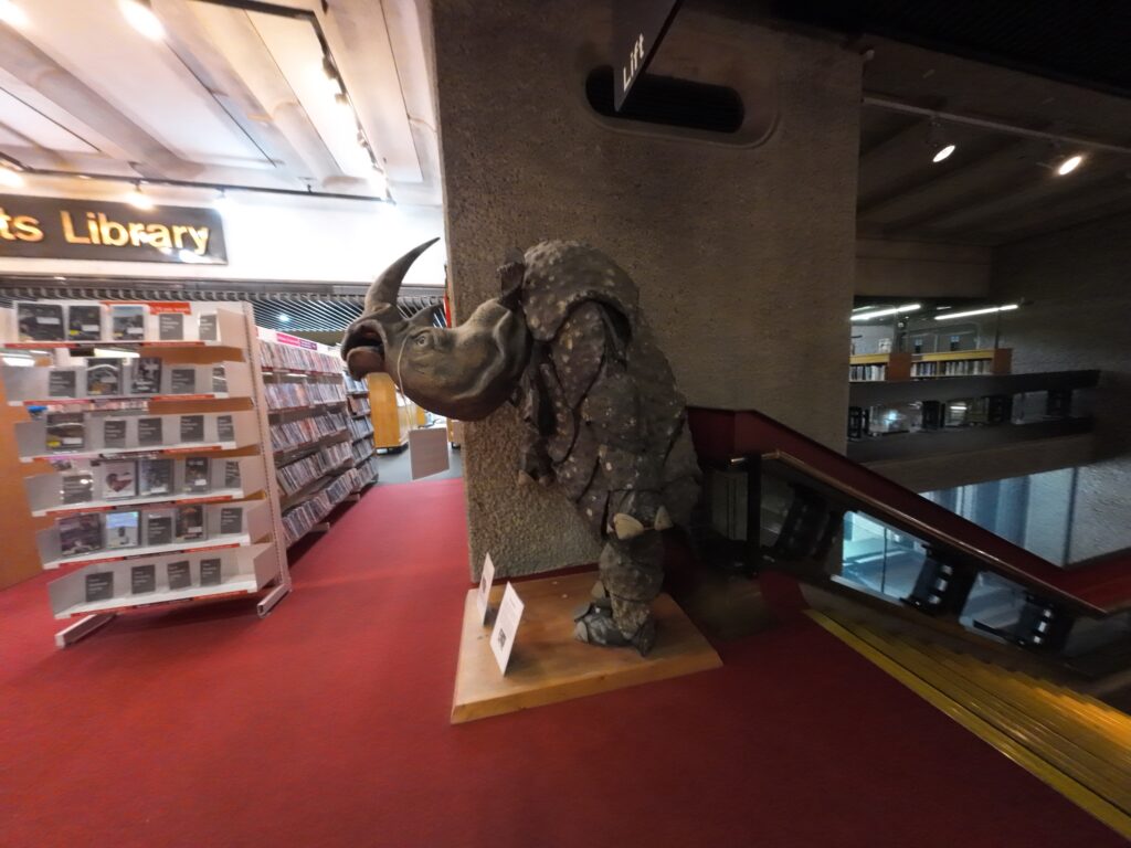 2階から入ると「Rivers and Roads」という絵画展が開催されていた。芸術作品の展示はバービカンセンターにあるこの図書館の強みであろう。中に進むとカウンターがあり,左手には「アートライブラリー」がある。DVDのコレクションが充実していた。カウンター奥には音楽図書館に通じる階段があり,大きなサイの人形が置かれている。右手には一般向けの図書が並んでいる。特集コーナーとして,イギリスで取り組まれているEast and South East Asian (ESEA) Heritage Month(東アジア・東南アジア文化遺産月間)があった。館内は静かであった。