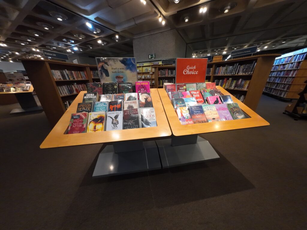 入口を入ると,左側に販売コーナーがあり,カード,文具,ノートのほか,九九の表まであった。コピー機ではスマホからデータを送ってプリントもできる。入口脇には詩のクラブのメンバーによる詩が展示されていた。図書の展示が多くされている。「新しい図書」「今週の図書」などの他,「図書館からの推薦」(Woking Recomendation)では書店の新刊売り場のように複本を重ねていた。Quick choice コーナーには The Reading Agency の Quick Read が並んでいる。予約棚には多くの図書が並んでいた。