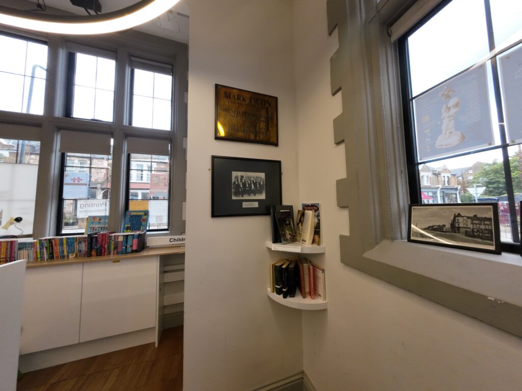 図書館に入るとすぐに,マーク・トウェインが開館に関わったことを記すプレートが目に入る。図書館内には大きな丸い照明があり明るく新しさを感じさせる。図書はバーコードで管理され,Due Dateが貼られている。入って右側には児童コーナー,左側には一般書と閲覧席がある。奥にはPCが数台置かれている。特集コーナーには村上春樹やアレン・ギンズバーグの図書,『ペルセポリス』やBanksyの図書などが並び,かなり渋い選書であった。また,ブレント区から移管されたと思われる外国語の図書も見られた。