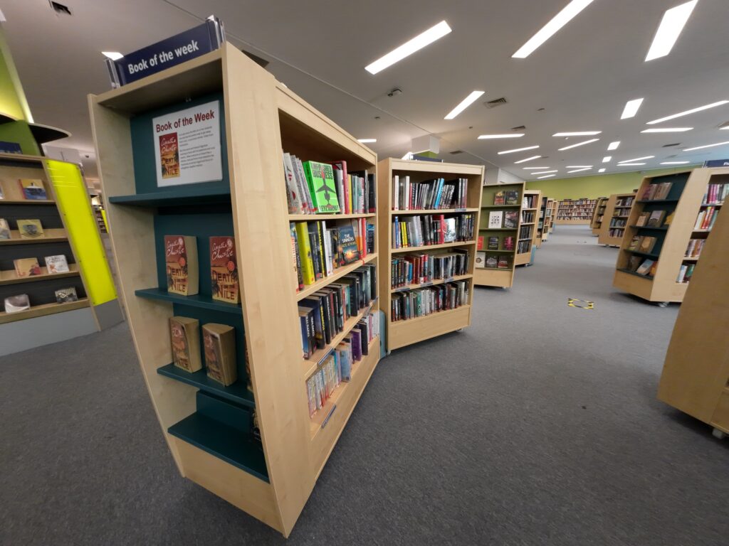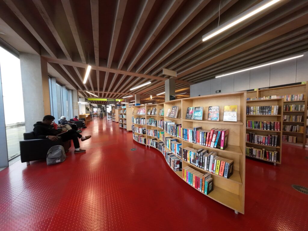 図書館の真ん中あたりにPCコーナーがあり,20台ほど並んでいた。閲覧席もある。利用者が多く滞在していた。それ以外にも館内には様々な机,ソファ席もあるが,机でPCなどの作業する人が目立つ。4~6人用のPODも2室あり,ひとつは使用中であった。地域資料も提供されている。入口奥には児童コーナーがある。空間は区切られておらず,訪問時には子どもの声が響いていた。排架はDDC順ではなくテーマごとで,「Business & Law」といった大きなテーマが棚上に表示され,小テーマが棚差しのような形で示されていた。テーマ中の図書は類にこだわらない。図書の背表紙にはテーマとDDC番号が併記されている。