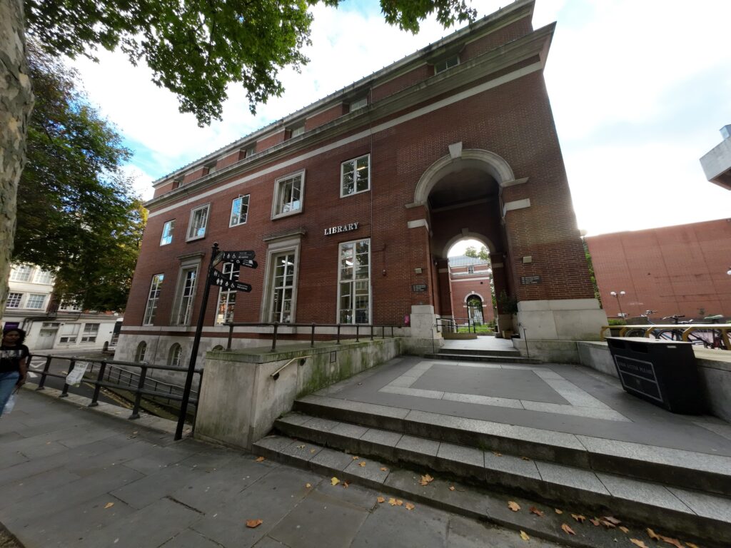 クロイドン区が非常な財政難であることは,サウスノーウッド図書館の紹介で書いたとおりである。理由は,区による不動産投資の失敗と不適切な財務管理と報道されている40。中央図書館は駅周辺の賑やかな場所のすぐ近くにあり,クロイドン時計塔と呼ばれる歴史ある建物の奥にある41。図書館自体は1993年に開館し,2010年には国内で3番目に貸出点数の多い図書館であったという42。2025年9月中旬まで,1階部分が改装中であった。