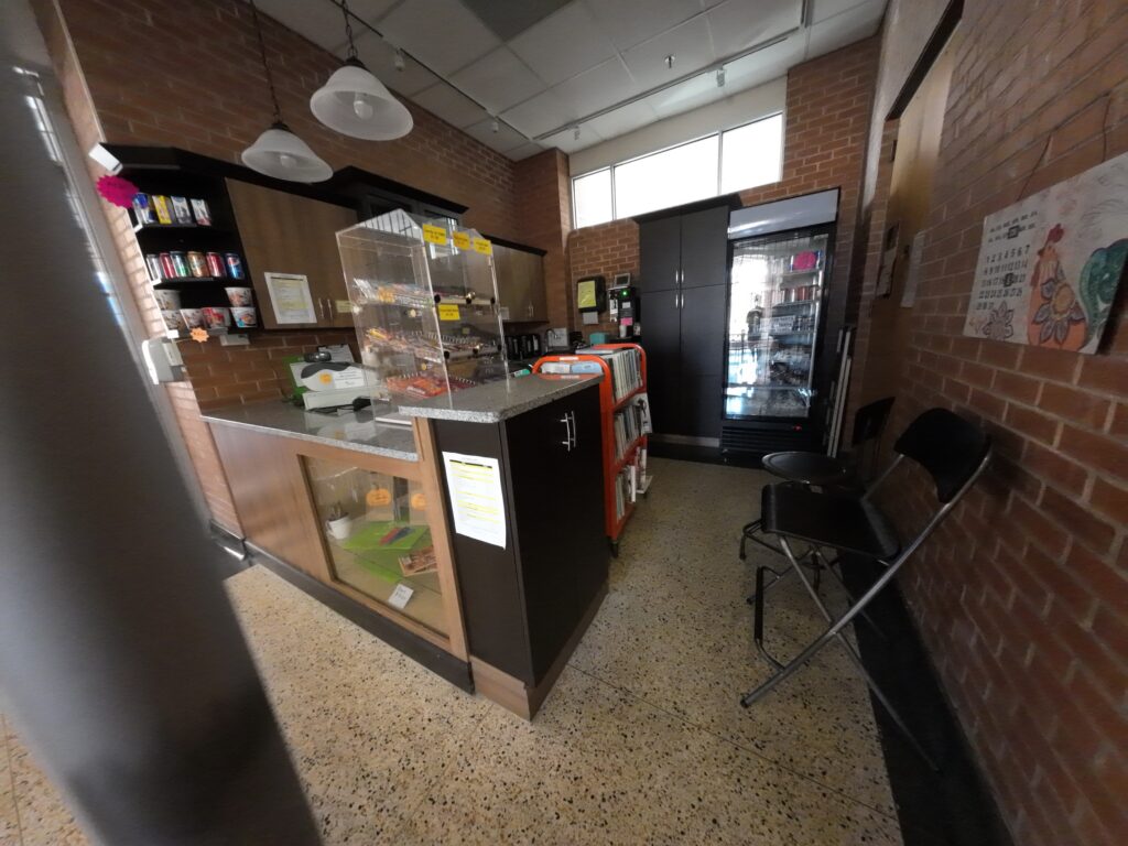 まず,入口を入ると左手にカフェがある。訪問時は閉まっていた。このカフェはボランティアによって運営されている。基本的に必要なものは全て図書館が提供し,ボランティアはカウンター対応のみとのことだった。コーヒーは2カナダドルもしない価格で,非常に手頃である。コーヒー以外に,お菓子,カップ麺,ジュースなども販売している。このカフェと入口を挟んだ反対側にはボランティアの部屋がある。ボランティアは市内で200人(!)ほどが活動しているという3。