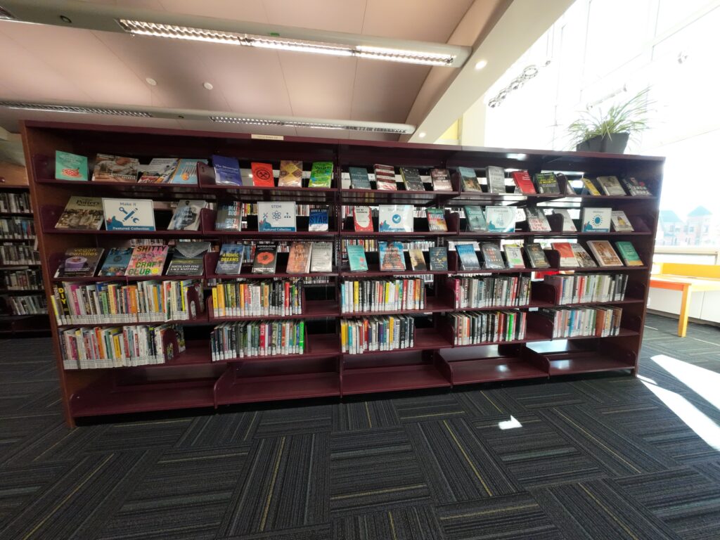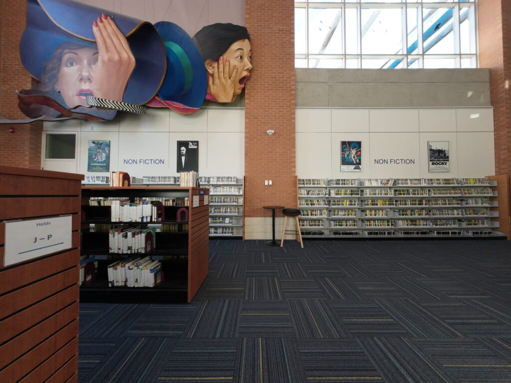 館内ではDVDも多く所蔵されている。訪問時,実際に複数の利用者がコーナーをブラウジングしていた。図書館ではストリーミングサービスのhooplaも契約しているが,それにより視聴できるタイトルは限られるとのことで,DVDの需要は依然として高いとのことだった。これまで見てきた図書館の中には,ストリーミングへ移行したところもあれば,依然としてDVDなども購入しているところもあった。契約しているストリーミングサービスでカバーできる作品や予算削減の圧力などが方針に影響を与えているように感じた。