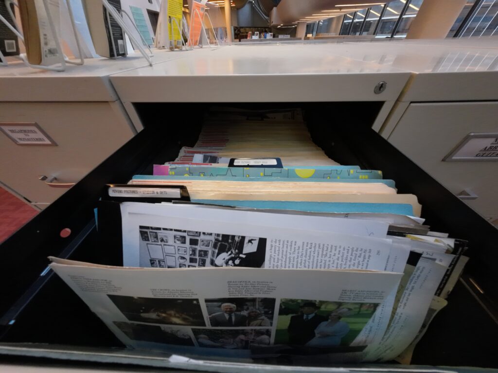 5階は「芸術」のフロアである。Marilyn & Charles Baillie Special Collections Centreは独立した部屋で14,アーサー・コナン・ドイル関連資料を含む特別コレクションがある。部屋はガラス張りで,閲覧席は円形である。コナンドイルのコレクションの中には,日本語の翻訳図書も見られた。音楽コレクションも充実している15。レコードの視聴用キャレルがある。製本された楽譜も多く4.5万点以上あるという。また,Pictureコレクションがあり,雑誌から切り抜いた画像に件名が付けられ,キャビネット内のフォルダに収められていた。100万点以上あるという。索引はカードになっている。デジタル化もされているが職員のみのアクセスである。中を見てみると,例えば,Rain というフォルダのあとは Rain Acid –> Rainbows —> Rainbows Art といった順番にフォルダが並んでおり,フォルダ内には複数枚の切り抜きが入っている。切り抜きの一枚一枚には蔵書印と一連番号が付されていた。
