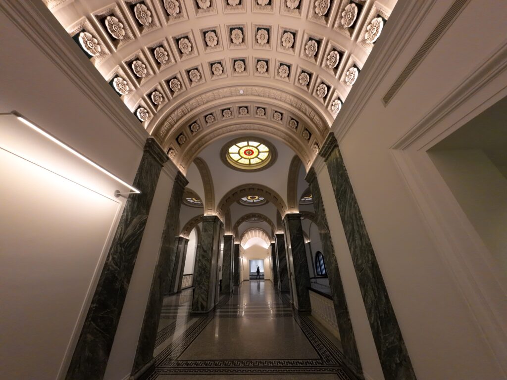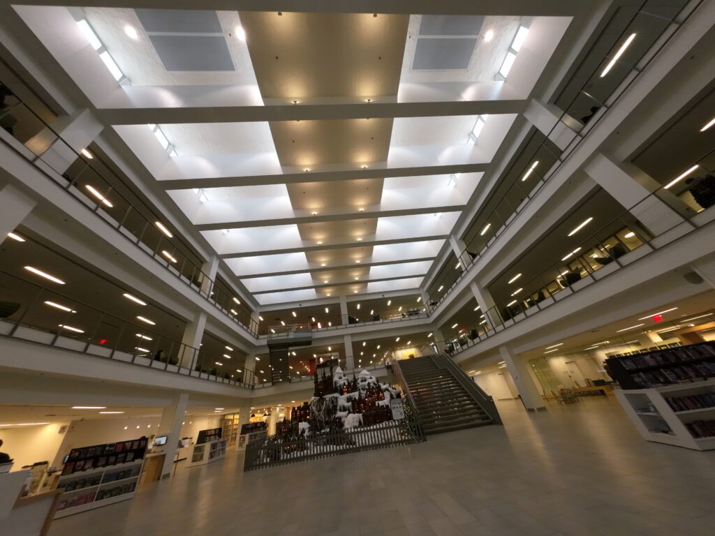 入口を入ると正面に「A thriving community where wisdom prevails」と掲げられている。これは図書館のビジョンである。館内の何カ所かで,白い壁にプロジェクターで映像が投影されていた。中央入口の左側には「Celebration of Learning」というコーナーがあり,多くの人物の写真が壁に飾られている。この取り組みは1993年から行われている。コロンバスにおける学びやその成果を祝う場として位置づけられている。詳しくは後述する。旧館2階は「パトリック・ロシンスキー・ギャラリー」と呼ばれ,絵画などの展示が行われていた。ロシンスキー氏は2002年から2022年までCEOを努めた人物である。ここから新館の2階へ直接移動できる。