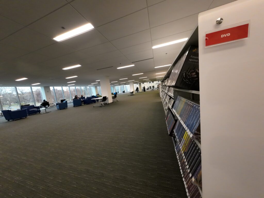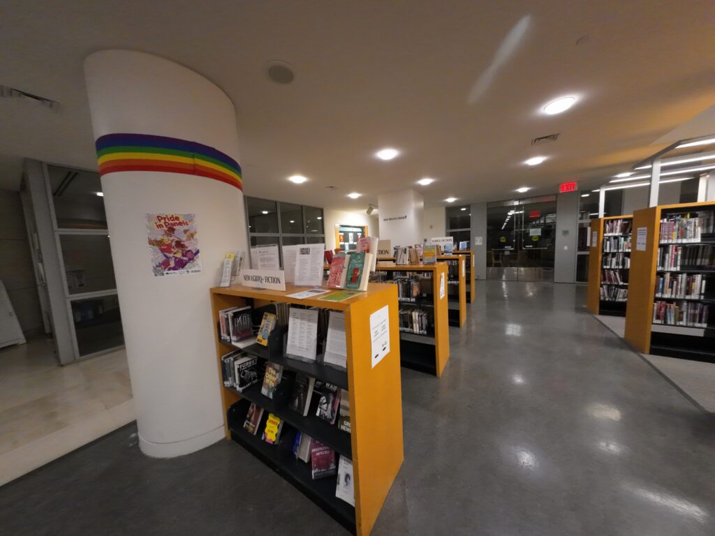 1階にはカウンターがある。周辺には新刊のフィクションが展示されている。また,奥にはフィクションが排架されている。ジャンルごとにも排架されており,アーバン,ロマンス,ミステリーなどが独立した棚を持っていた。「ラッキー・ディ・フィクション」というコーナーもある。これは,「予約不可,貸出延長不可,待たずに借りられる」と書かれている。大量の予約のついた図書をすぐに借りられるようにしているものである。図書にはICタグが貼付されており,自動貸出機も利用できる。OPACはBiblioCommonsが使われている。他に予約図書,LGBTQフィクション,大活字本,グラフィックノベルもある。奥にはオーディオビジュアルセンターがあった。ここには,CD,DVD,オーディオブック,多言語映画がかなり充実している。レコードもおよそ1,500枚ほどあった。最近は視聴覚資料を縮小している図書館も少なくないが,ここは今でもしっかり収集している印象を受けた。