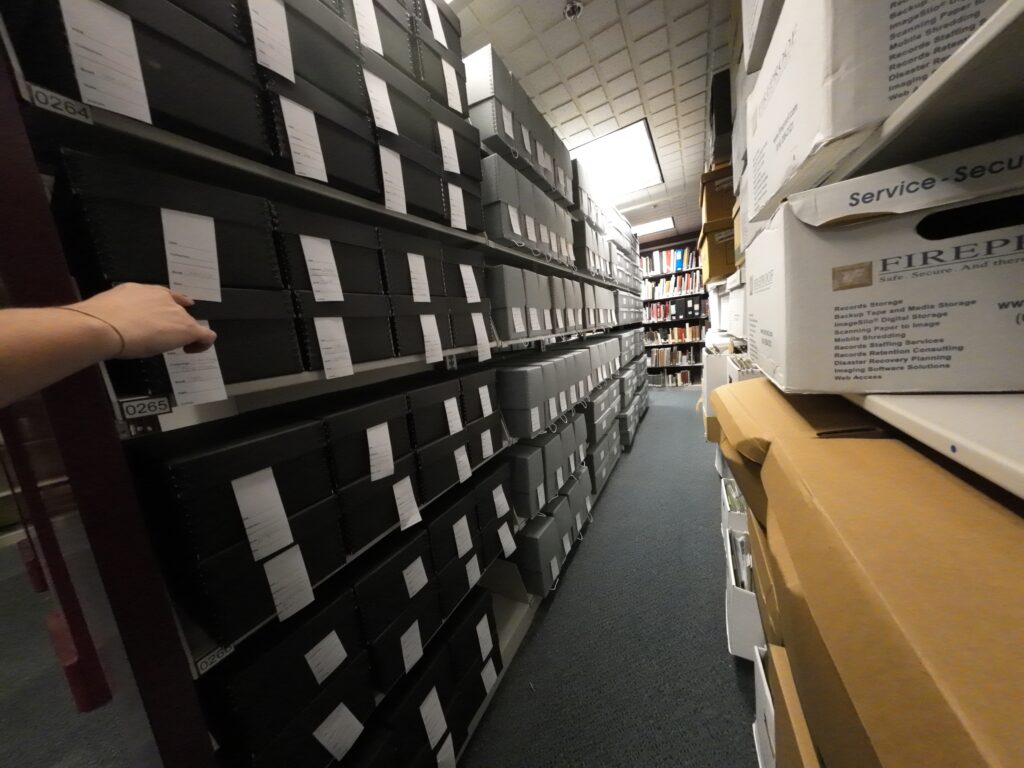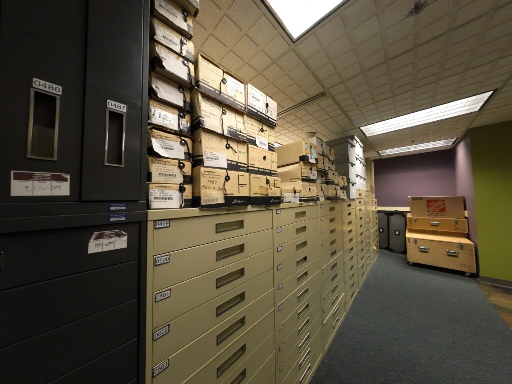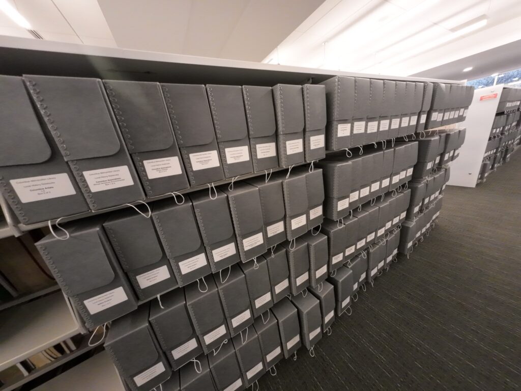 地下室の別の部屋には寄贈を中心とした貴重資料が多く置かれていた。新聞社から寄贈された写真コレクションなども充実している。これらは保存用ケースに入れられ,その中でフォルダごとに整理されていた。行政資料の寄託も受けていた。デジタル化作業は3階のデジタルハブで行われており,ボランティアの支援も受けながら進められている。デジタルアーカイブ「My History」の収録件数は200万件を超えている4。CMLは,アメリカデジタル公共図書館(DPLA)のサービスハブの一つであるオハイオ・デジタル・ネットワーク(ODN)に参加しているため5,CMLの資料はDPLAを通じても閲覧することができるようになっている6。