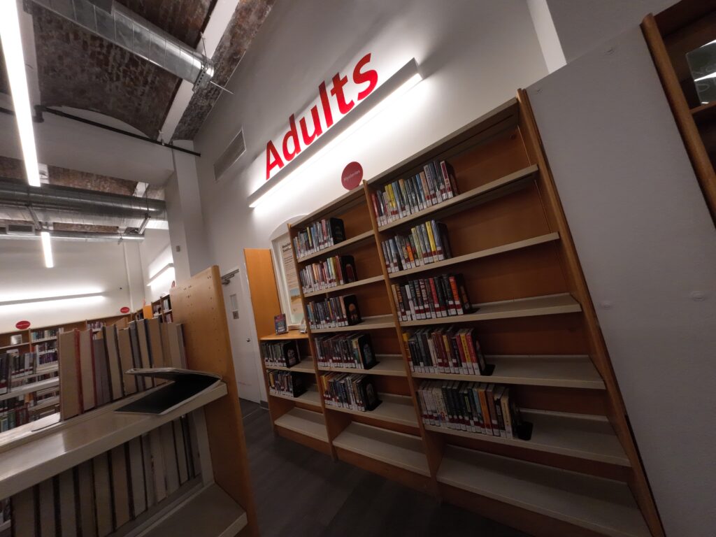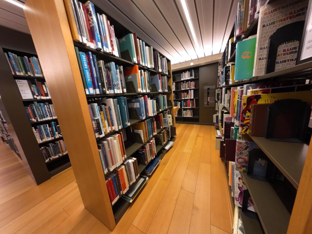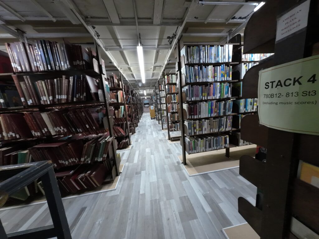 階段で2階に上がると,カウンターのある閲覧室がある。ここにはフィクションとノンフィクションの両方が配架されている。書架は5段で比較的高い。全体にこの図書館は,施設・什器がクラシカルである。PCや閲覧席もある。カウンター横にはレファレンスブックが中二階にあるが,職員のみアクセスできる。さらに奥にも大きな閲覧スペースが続いており,図書館の奥行きに驚かされる。左右には積層書架があり,左側には比較的人気のある資料が多く,貸出用資料のような位置づけのようであった。右側は比較的古い資料も含まれており,書庫的な役割を担っているように見える。ここも利用者は自由にアクセスできる。こちらはなんとノンフィクション中心の積層書架が6階分ある。意外と利用者がいるのがおもしろい。かなり古い図書に自由にアクセスできることも関係しているのかもしれない。