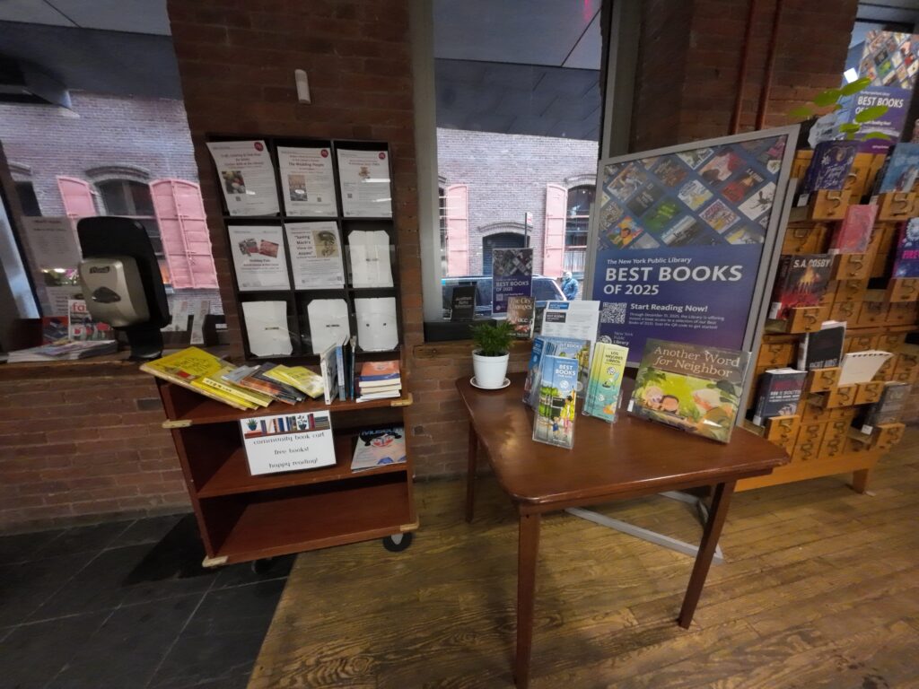 入口を入ると,「コミュニティブックカート」と書かれたスペースがあり,図書の販売が行われていた。すぐ横にはカウンターがある。この階には,新刊,雑誌,コミュニティ情報,ブラウジングコーナー,ローカルヒストリーのコーナーなどがあった。ニューヨーク公共図書館では「Best Books of 2025」を選定しており,そのことを知らせるポスターも掲示されている25。また,「Celebrating the Schomburg Center for Research in Black Culture」というコーナーも設けられていた。これは,NYPLの研究図書館の一つであるションバーグ黒人文化研究センターを中心とした取組の一環である26。