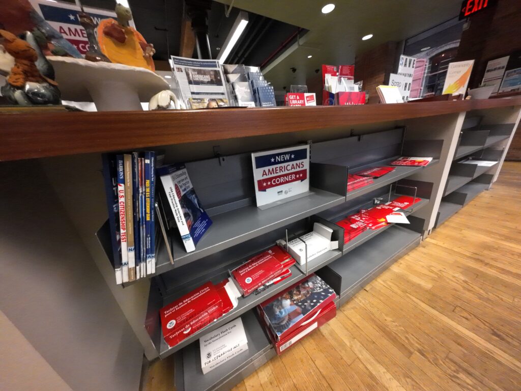 館内には8人用の閲覧席が3つあり,利用者が作業をしていた。鉄道のジオラマも設置されていて,子どもがじっと見入っていた。NYPDと同様に,USシチズンシップに関するパンフレットやリーフレットも置かれている。それらはアメリカ市民権取得を支援するための案内資料である。入口付近では「冬のフードドライブ」という取組も行われていた。家庭にある缶詰などを持ってきてもらう。これはQPL全体の取組で,City Harvest という団体と連携して実施されている。