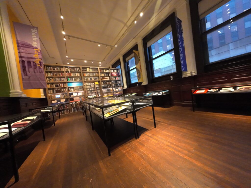 2階には,ニューアーク出身の著名な作家である Philip Roth のパーソナル・ライブラリーがある34。テーマごとに11の展示ケースが用意され,中には校正原稿,図書への書き込み,オバマ大統領から授与された米国人文科学勲章,書簡,子どもの頃の帽子,各国語に翻訳された著作,タイプライターなど様々なものが展示されていた。ロス氏の部屋は,実際の書斎の蔵書配置を忠実に再現している。兵役中の怪我により立って執筆をしていたが,その際,使用していた椅子も展示されていた。こぢんまりとした空間ではあったが,ロス氏の功績がよく伝わるよい展示であった。