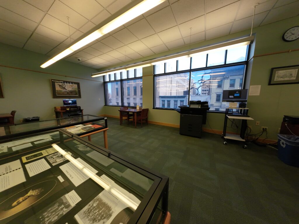 地域資料と系図資料の部屋は「ケンタッキー・ルーム」と呼ばれている5。ここでは,ケンタッキー州およびレキシントンを含むフェイエット・カウンティに関する資料が集められている。市民からの寄贈資料も多い。この部屋の窓には,資料への影響を抑えるための特殊なフィルムが貼られていた。テーマ別のレキシントン歴史索引等がある。新聞のマイクロ資料も所蔵されているが,こちらは2018年までで,それ以降はデジタル化している。図書館における資料のデジタル化はアウトソーシングではなく,書庫内に簡易スタジオを設け,撮影し,デジタル化,OCR処理を行っているとのことであった。古い資料ではOCRの精度が十分でない場合もあり,確認しながら作業を進めているという。