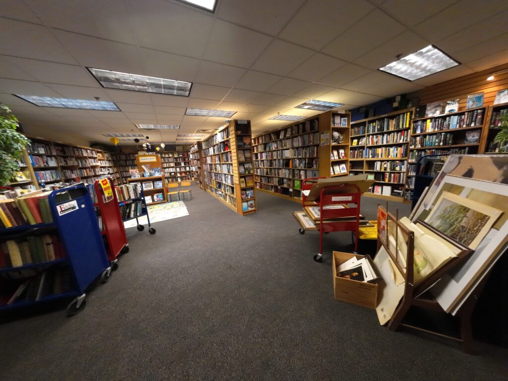 地下にはフレンズ・ブック・セラーがある6。地下に降りると,「こんなスペースが地下にあるのか」と思うほど広いフロアが広がっていた。販売されている図書はジャンルごとに分けられていた。図書館の除籍資料に加え,市民からの寄贈図書も含まれている。見事な図書のクリスマス・タワーもあった。