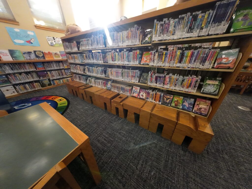 児童フロアには,絵本,グラフィックノベル,フィクション,ノンフィクションなどが並んでいる。グラフィックノベルの書棚の下には,「IMAGENATION」と一文字ずつ彫られたスツールが並んでいた。これを制作したのは,日本生まれで米国を拠点に活動している長澤伸穂氏である3。ノンフィクションはDDC順で配架されているが,サインはDDCではなくHistory,Country,Stateといったキーワードで掲示されていた。請求記号には児童書もカッター・サンボーン著者記号表による著者記号が付されている。奥には,数の数え方,形,アルファベット,色などをテーマとした幼児向け図書がまとめられていた。スペイン語の児童図書も多い。訪問時,親子など3人ほどが滞在していた。