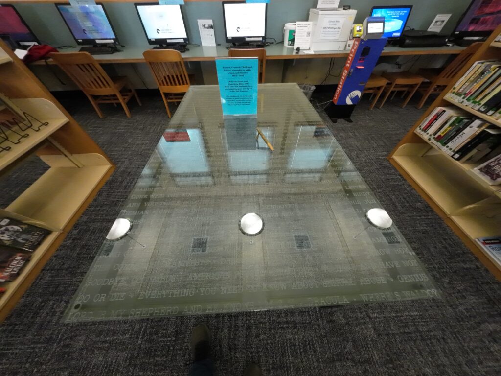 カウンターの後ろには,充実したコミュニティ掲示板があった。また,フィクションの一部(アーバン)や新刊図書の展示とともに,PCが5台設置されている。1台は使用中であった。プリンタやスキャナーもある。書架の間にはガラス製の美しいテーブルが置かれていた。テーブルには全米のBanned Booksのタイトルが記されている。これも長澤氏制作のものである。