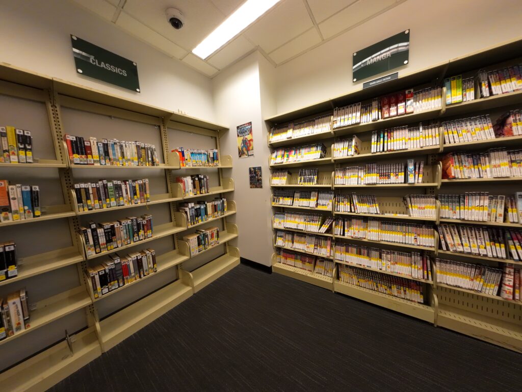児童コーナーには日本語の図書が置かれていた。ただし,スペイン語の図書と比べると点数は多くない。児童向けのグラフィックノベルには,ポケモンやスプラトゥーンといったタイトルが見られた。壁には読み聞かせボランティアの顔写真が掲示されており,「スターボランティア」と紹介されていた。紹介と募集を兼ねた掲示のようであった。TEENコーナーの手前にはZine Collectionsのコーナーがある。この点は後ほど触れる。この図書館では「ティーン・カウンシル」と呼ばれる集まりが開催されており,交流を通じて図書館をよりよくするための活動を月に2回行っている。コミックの所蔵は,アメコミと日本のマンガが同程度で,かなり充実していた。