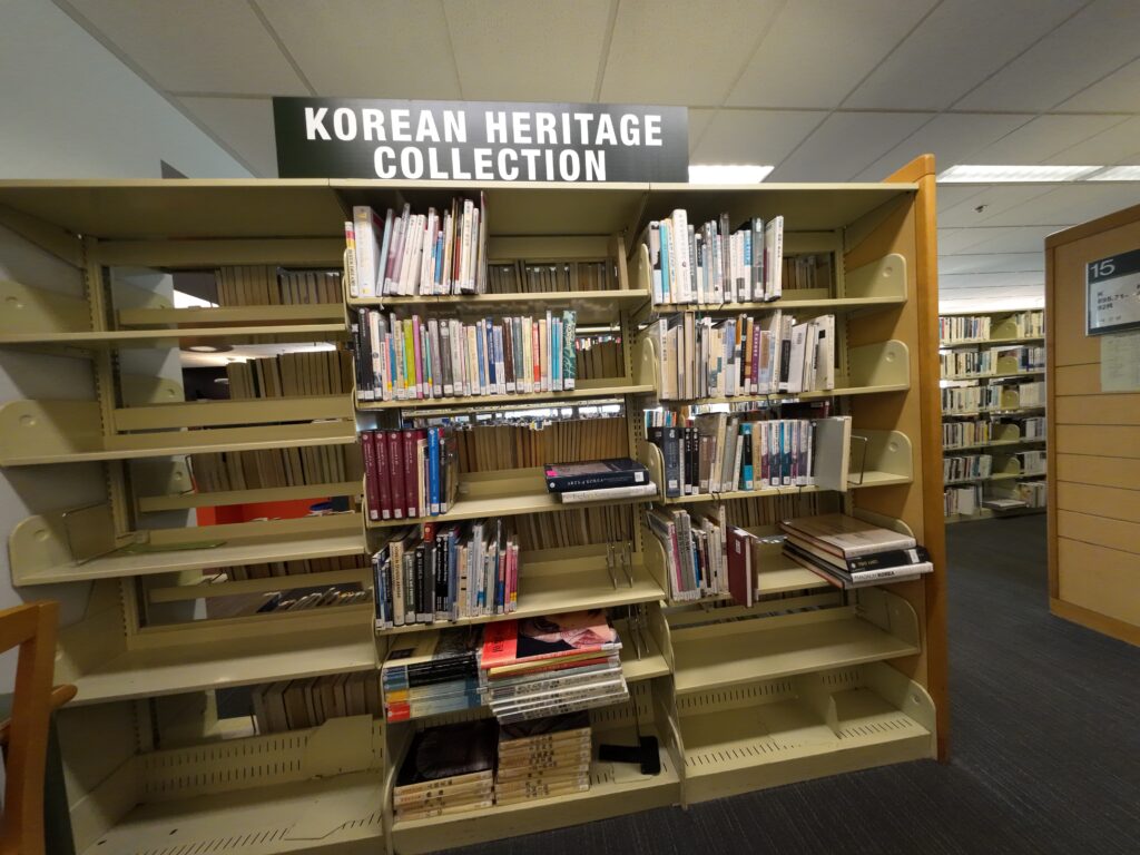 奥の韓国語図書コーナーの手前には展示スペースがあり,「クリエイター・イン・レジデンス」という取組の展示が行われていた。この取組は,別の機会に触れたい。韓国語図書は一般書を含めて充実していた。あわせてコリアン・ヘリテージ・コレクションと呼ばれるコレクションも配置されていた。部屋としては,他の分館でも見られたNew American Centerと,リテラシーセンターがあった。