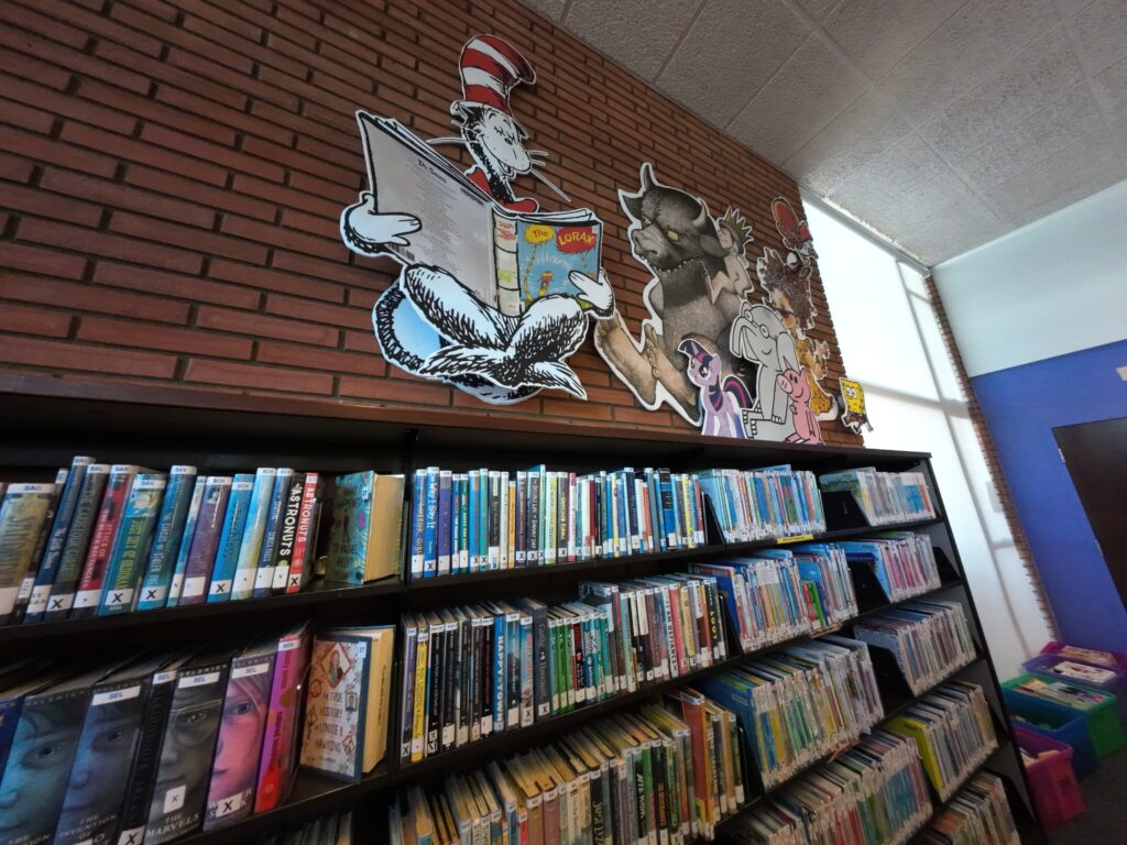 児童コーナーには,グラフィックノベル,ノンフィクション,フィクション,ペーパーバック(いわゆるシリーズもの),スペイン語の児童書などが排架されていた。奥には読み聞かせができるスペースがあり,そこには「図書はあなたを明るく照らす」と書かれていた。