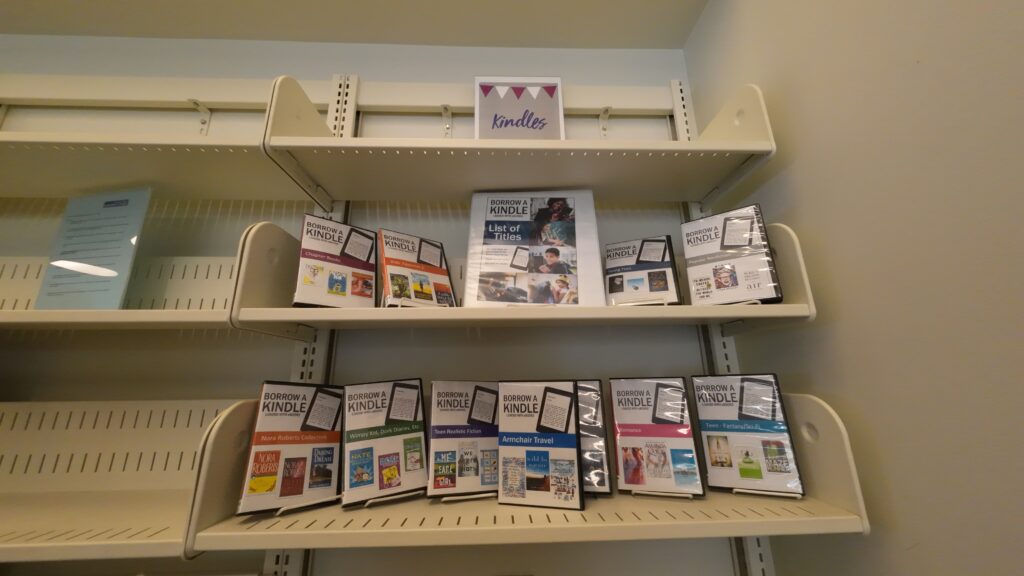 2点目は,「Kindleを借りよう」というコーナーがあった点である。これは,Amazon社のデバイスのKindleに特定ジャンルの電子書籍をあらかじめ収録し,それを貸出すというものである。この図書館に限らずカウンティ全体で展開している。OPACで確認すると,ウェストハリウッド図書館だけで60点以上のデバイスが所蔵されているようで,よく利用されている。ジャンルはヤングティーン,ロマンス,ポピュラー・ノンフィクション,ニューノンフィクションなど多様であった。