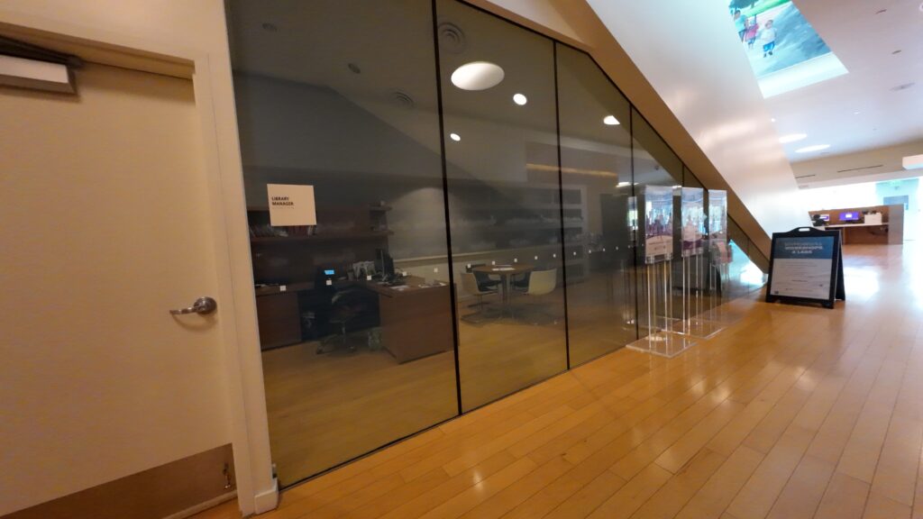 館内には自動貸出機がある。横にはHoldsの棚が設けられているが,量はかなり多かった。その前にはLibrary Managerのガラス張りの個室がある。オハイオ州のサウスウェスト公共図書館グローブシティでも職員の個室が利用者の空間と接している部屋を見た。KanopyやHooplaといった電子サービスの案内も目立つ。図書の裏表紙には館籍を示しているシールが貼られており,表紙をめくった前付け部分には受入年月のスタンプが押されていた。RFIDは貼付されていない。OPACを確認すると,ILSはSirsiDynix社製であった。