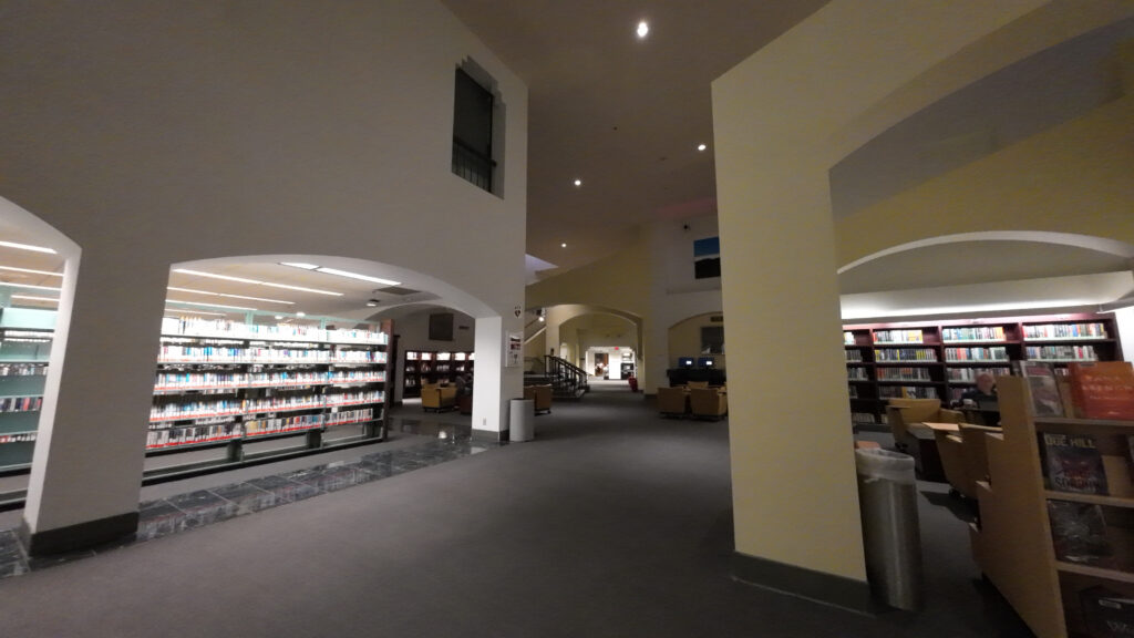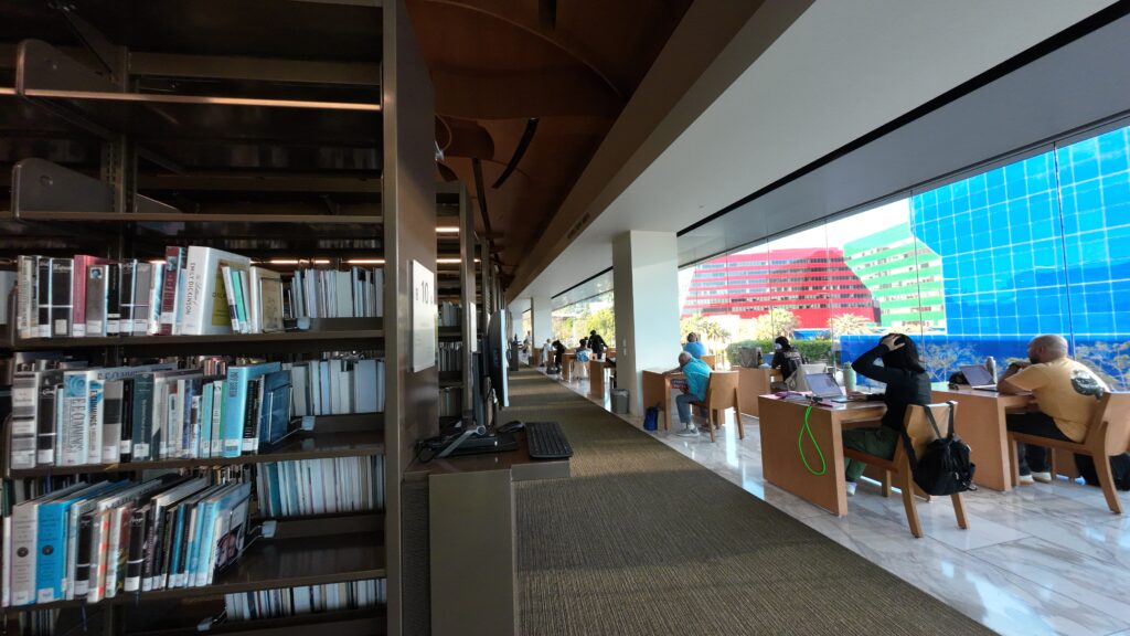 ロサンゼルス公共図書館(LAPL)の分館の一つで,コリアタウンある40。エリアとしてはハリウッドエリアに属する。隣接する公園と駐車場は工事中であった。駐車場を地下に移し,その上に公園を整備するとのことである41。あわせて,図書館の読書スペースや交流スペースも設けられる予定である。これまで訪問した分館の中では,最も規模が大きい。以前,カレントアウェアネスで「紙の本のないデジタル公共図書館、ロサンゼルスで検討中」として紹介された図書館である42