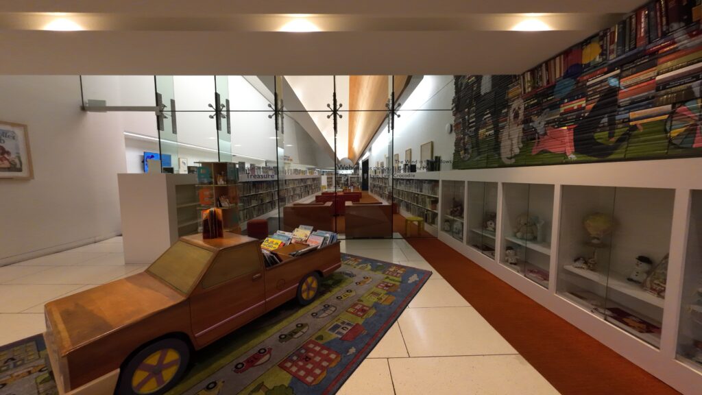 入口を入ると,2階まで吹き抜けになっているスペースがある。開放的である。カウンターの近くにはカフェ(Kelly’s Coffee & Dodge Factory)があった22。隣には友の会の書店もある23。入口を背にして右手に児童室がある。部屋の前には木製の大きな車が置かれていた。吹き抜けのある1階部分には主にDVDと自動貸出返却機がある。少し奥に進むとフィクションが始まり,さらに進むとノンフィクションが並ぶ。その先にはティーン向けコーナーがある。続いて伝記,グラフィックノベル,雑誌のあるブラウジングコーナーと続く。一番奥には見事な閲覧スペースがある。勉強がはかどりそうである。この閲覧スペースは,誕生日パーティー,家族の集まり,ビジネスランチなどにも貸出されていた。