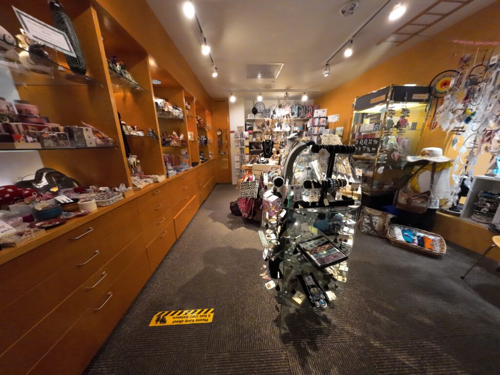 入口を入ると,図書館本体の入口まで通路が続く。その空間では美術品の展示が行われていた。また,友の会の活動が,上品に紹介されている。ゲートを入ると正面が総合カウンターであり,自動貸出機も2台設置されていた。図書館のサービスはほぼこのフロアで提供されている。空間を活かしてソファなどがゆったりと配置されていた。右手には友の会によるギフトショップがある。友の会といえば古書店運営が多い中,ここはやや趣向が異なる。世界各地から集められた雑貨や文具,カード,地元著者の著作,装飾品など多種多様なものが並んでいた。