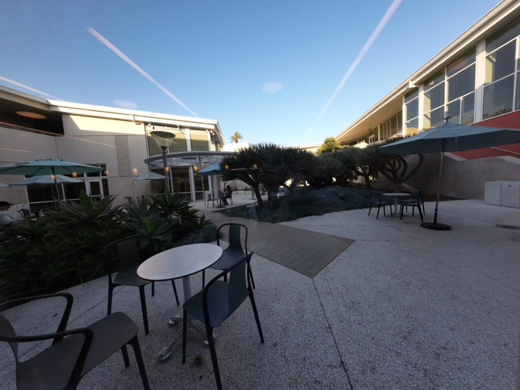 入口の反対側には,ヘリテージ・コミュニティ公園とつながるテラス席があり,訪問時には10人ほどが勉強していた。ロサンゼルス周辺は1月でも日中は20度を超える日が多く,このテラスはとても気持ちのよい空間であった。