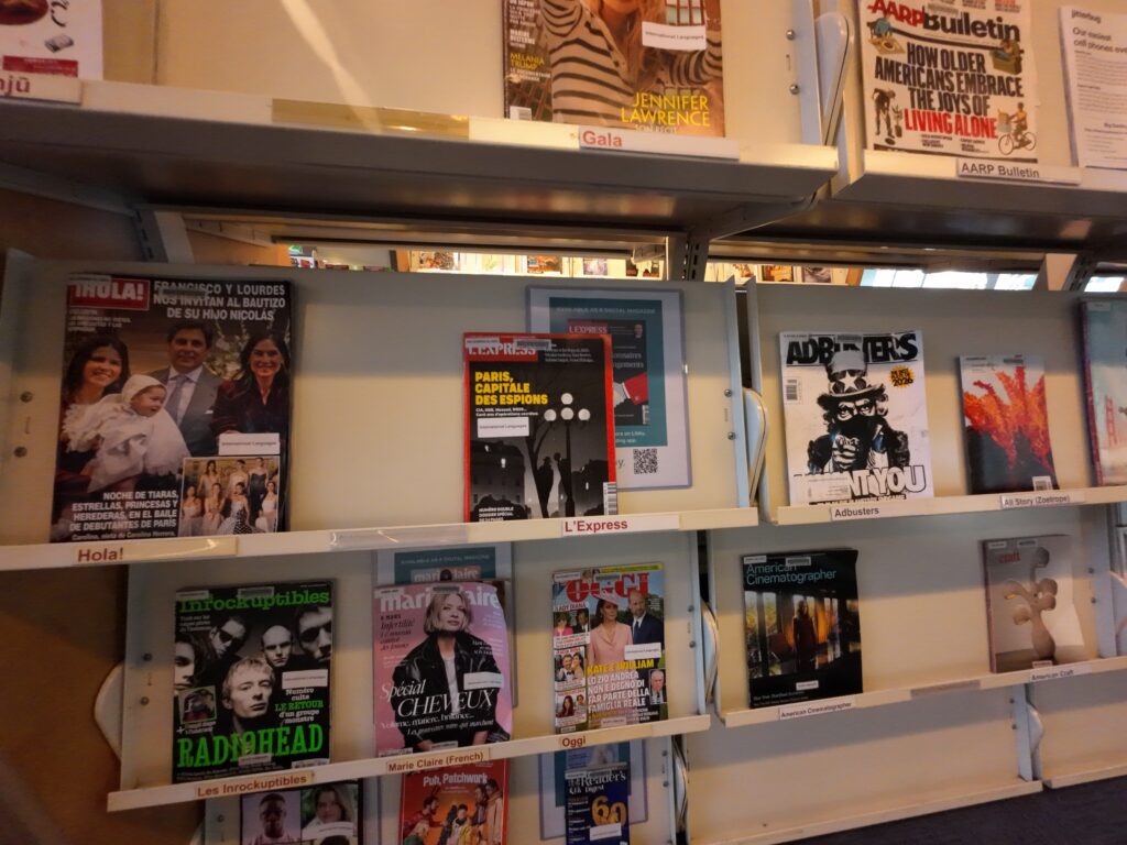 奥へ進むとインフォメーションカウンターがある。1階にはフィクション,大活字本,雑誌・新聞,視聴覚資料(CD,DVD,オーディオブック),ビデオゲーム,グラフィックノベル,児童コーナー,TEENコーナーがある。フィクションはミステリー,サイエンスフィクション,ペーパーバック,ロマンス,Ready Read などが別置されていた。雑誌・新聞コーナーでは,オンラインアクセス可能なタイトルについて,Libby,PressReader,ProQuest などの案内がそれぞれの雑誌架でされていた。ざっと見たところ,およそ3分の1程度のタイトルがオンラインでも利用できるようであった。一方で,物理的な雑誌も引き続き購入されており,すぐに紙媒体をやめるわけでもないようであった。ビデオゲームは任天堂のものであった。