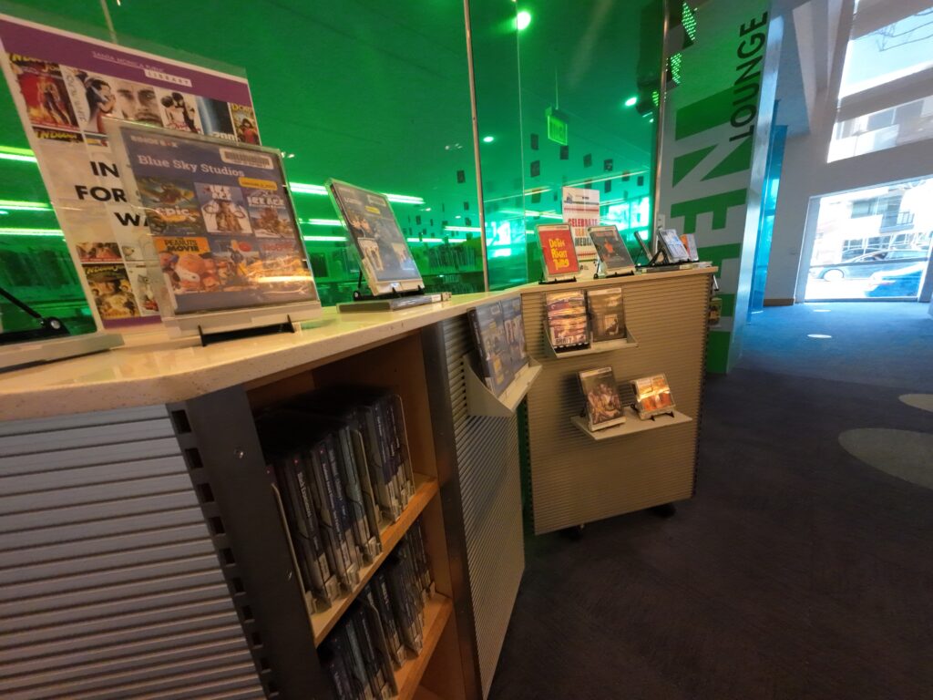 フロアを入口を背にして右側から見ていくと,まず多言語図書のコーナーがある。中国語,簡体字中国語,ペルシア語,ドイツ語,タガログ語,ベンガル語,ヒンディー語,日本語,韓国語,ポルトガル語,ロシア語,スペイン語など,非常に多様である。中国語は繁体字と簡体字が分かれており,冊数としては繁体字が多い。視聴覚資料としては,DVD,ビデオゲーム,CDなどが豊富にある。DVDは映画,テレビ,多言語映画,ノンフィクションに分かれていた。ビデオゲームを所蔵している点は,ロサンゼルス周辺では珍しい。