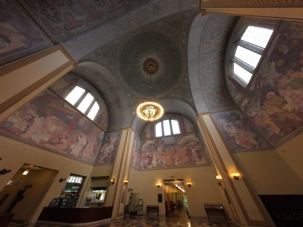 児童室は重厚な雰囲気でとても美しい。訪問時には,その日,開催が予定されていたレゴのイベントの準備が進められていた。児童室には各種の貴重なコレクションも収蔵されている65。また,この階にはギャラリーがあり,中央図書館100周年の展示会が開催されていた66。そして,この階では「ロタンダ」と呼ばれる見事な天井装飾を見ることができる67。