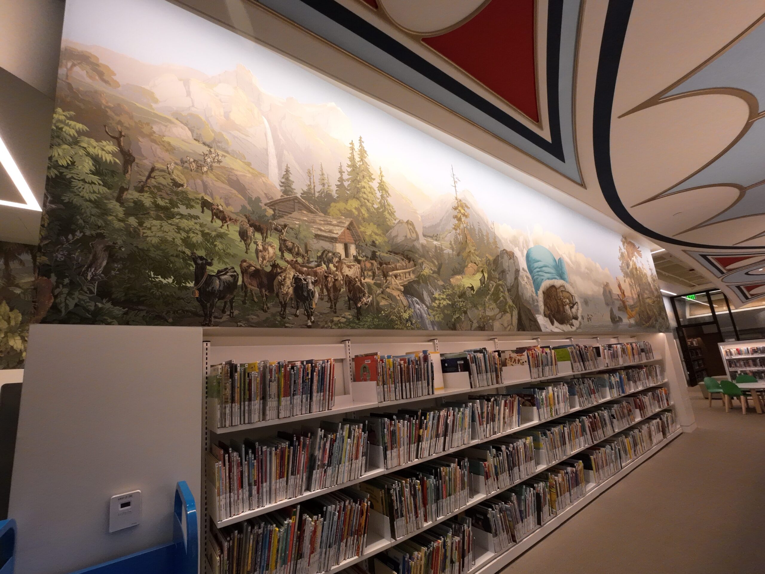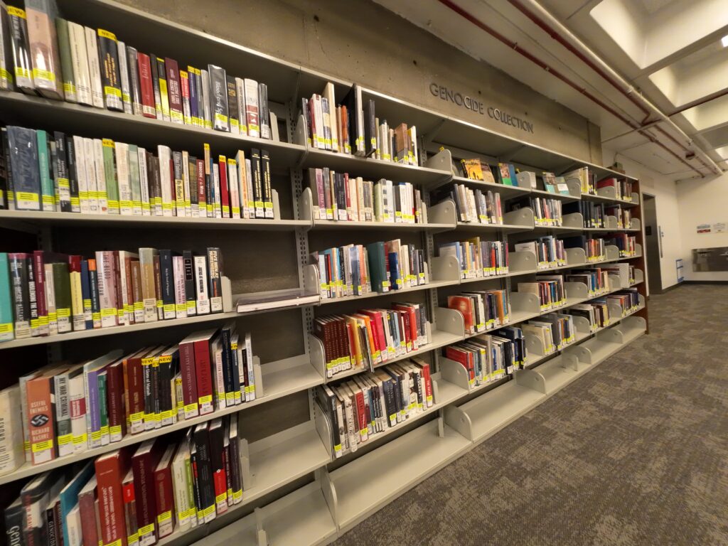 近くには ReflectSpace と呼ばれるギャラリーがある。これは2017年に,人道的な残虐行為に向き合う空間として議会の要請により設けられたものである4。これまでに,アルメニア人虐殺,慰安婦問題,日系人強制収容所などが取り上げられてきた。訪問時は改修中であった。返却機として,返却ボックスに入れられた図書を自動的に仕分ける大型の機械があった。北欧の図書館でよく見かけたものだったが,北米ではあまり見ることがなかった。右手側のスペースにはノンフィクションを中心とした書架が並んでいる。奥にはグラフィックノベルとマンガのコーナーがあり,日本のコミックも多く見られた。多言語図書も所蔵されている。日本語資料もあるが,特にアルメニア語資料が充実していた。この地域にはアルメニア系住民が多く居住しているためである。近くには「ジェノサイド・コーナー」があり,アルメニアのジェノサイドに関する資料が集められていた。
