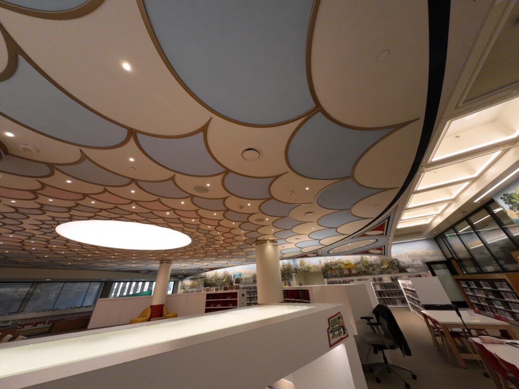 中央カウンター横には2階へ上がる階段があるが,これもリノベーションに伴って新設されたものである。2階には児童室がある6。空間として完全に分離されているため,音が外に漏れにくい。中央には円形のスペースがあり,その周囲に児童書が排架されている。壁には動物などが大きく描かれていたが,いずれも絵本に登場するモチーフである。天井にはうろこのような模様が描かれている。これはアルメニアの伝統的な模様であるという。奥には長細いの部屋があり,こちらは年長の子どもが静かに読書できるように空間を区切っているとのことであった。