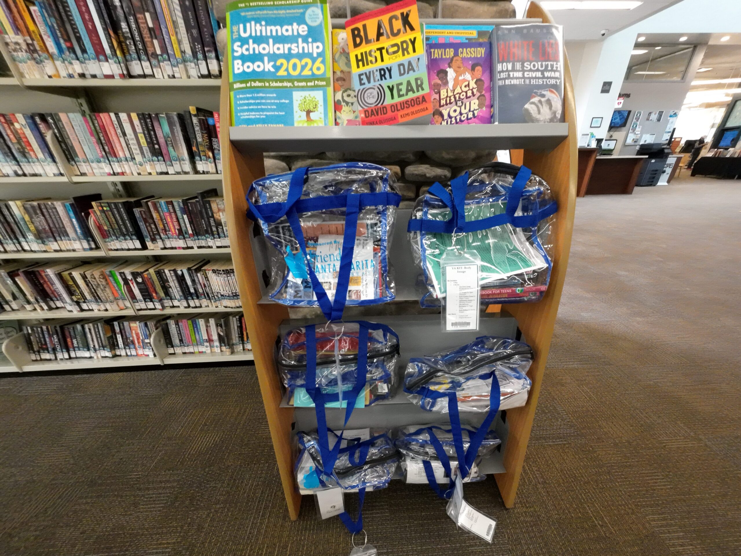 TEENコーナーには,フィクション,ノンフィクション,グラフィックノベルが排架されている。興味深かったのは,図書,情報,ものを組み合わせたバッグである。テーマは,ボディイメージ,鬱,感情のコントロール,マインドフルネスなどであった。マインドフルネスのバッグには,関連図書5冊,情報シート2枚,カードデッキが入っている。これらは図書館スタッフがテーマを考え,資料やツールを組み合わせて作成しているとのことであった。この階には,スタディールームやコンピュータラボもある。コンピュータラボの前にはデルのラップトップキヨスクが設置されていた。この図書館もパスポートサービスを行っている。