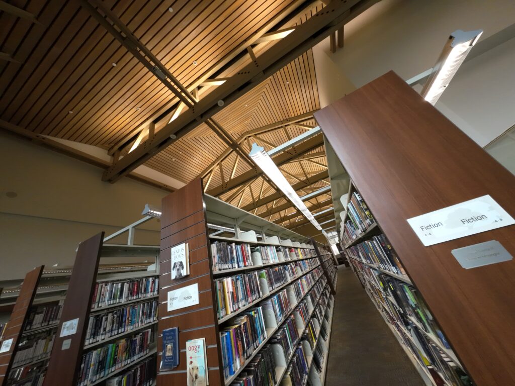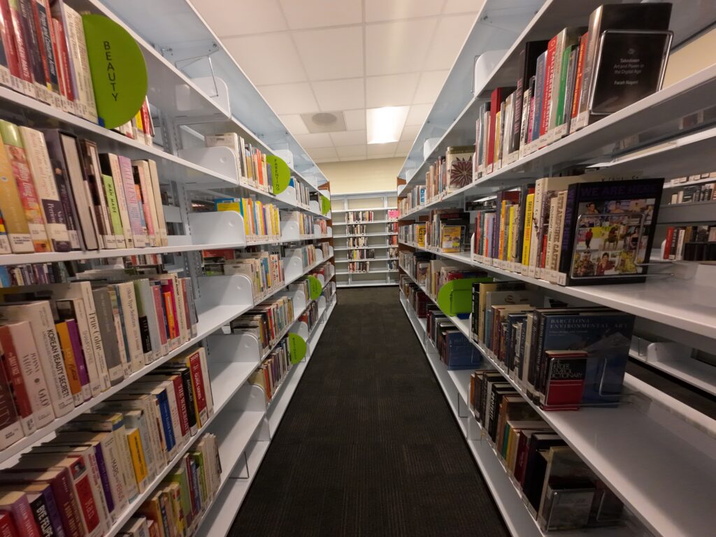 ゲートを通ると,左手に比較的大きなカウンターがある。自動貸出機もある。カウンター前のフロアには,新刊図書,CD,DVD,オーディオブックが並んでいる。但し,図書館委員会の2025年5月の議事録によれば,CDと後述するPLAYWAYの購入は需要を考慮して停止されたとのことであった。新刊図書の展示には中国語図書が一画を占めている。コピー機も設置されており,スキャナーによる電子的複製も可能である。スキャン料金は1枚5セントであった。日本でも,著作権法第31条の範囲内であれば,デジタル複製は可能なのではないだろうか。