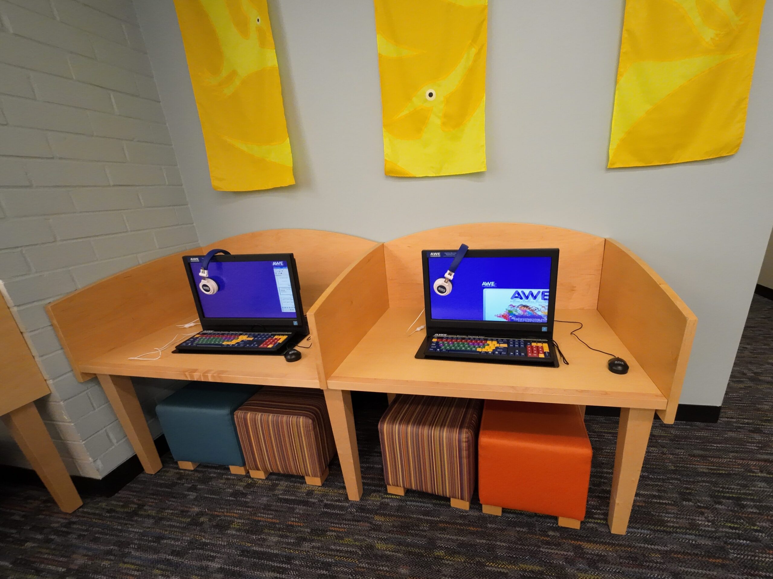 児童コーナーの一画には家庭学習法やその教材(教科書や問題集)などがまとめられていた。教材はコピーして使ってもらうことを前提としているとのことであった。ホームスクール用の資料も含まれている。PCやAWE端末もあり,AWEは人気が高いが,定期的なバージョンアップが必要とのことであった。