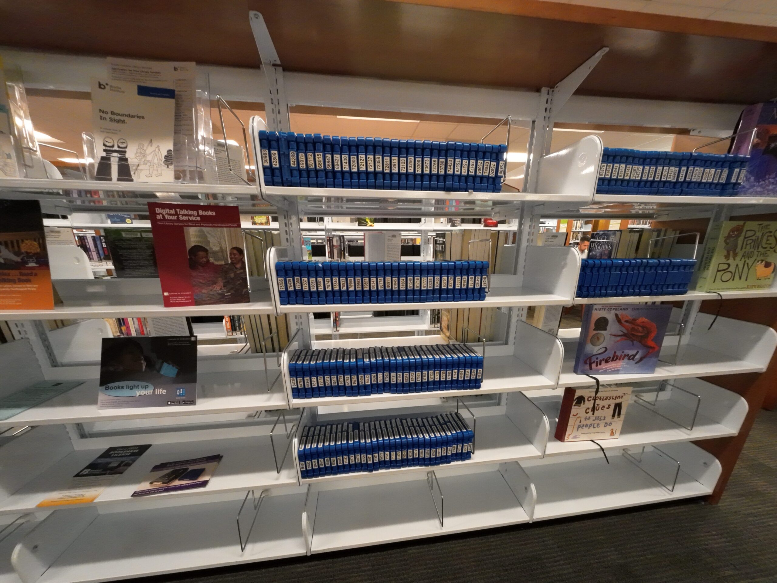 入口付近には「新年」を特集した展示がある。また「Blinde date with Library」も行われていた。これはロサンゼルスの公共図書館でも見かけた。点字図書のメモリーの貸出も行われている。Braille Institute Library が貸出しているデジタルプレイヤー用のメモリーがある。バーバンク中央図書館でも見たが,これまで訪問した図書館の中では量が最も多い。フィクションなどでは2冊程度の複本が多く見られた。この点について尋ねると,基本的には利用者のニーズに応じて複本数を調整しており,利用が集中している間は冊数を増やし,落ち着けば2冊程度に戻すという。