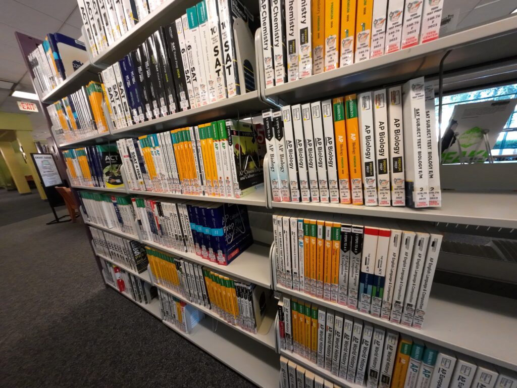インフォメーションカウンターの先にはノンフィクションが排架されている。奥にはTEENコーナーがあり,PCが4台設置されていた。ソファや机も多く,滞在しやすい。TEENコーナーにはフィクション,ノンフィクション,グラフィックノベル,テスト準備用資料が排架されている。テスト準備の棚にはCliff’s Notesのシリーズが並んでいた。これは文学作品などを要約した学習ガイドである。資料の傷み具合から,よく利用されていることが分かった。試験対策資料は大人向けコーナーにもあり,大学院向けのGMAT / MCAT,大学進学向けのGED / TOEFL / TOEIC,さらに職業関連のASVASなどこちらも充実していた。