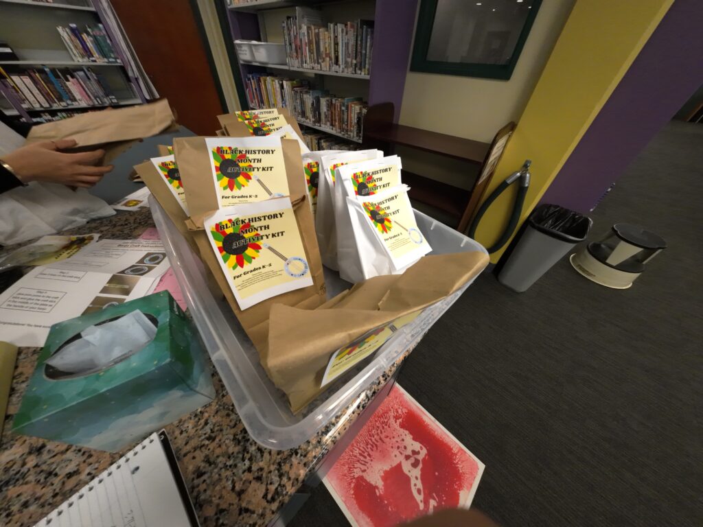 児童向け資料は,フィクション,ノンフィクション,ポピュラーキャラクターブック(ポケモンなど),絵本,DVD,おとぎ話などがある。フィクションは学年別に幼稚園から2年生,3〜4年生,5〜6年生と分けられていた。ノンフィクションの棚差しには,文字とともに絵が描かれているのがよい。シリーズものは同一著者の作品がまとめられて並んでいた。こうした細かな配慮が随所に見られる。奥には読み聞かせ用の部屋があり,子どもが座る席には段差がついていた。カウンターには「ブラック・ヒストリー月間アクティビティ・キット」が置かれていた。月ごとのテーマに合わせて作成されている。今月のものには,特集の解説,図書リスト,CDリスト,工作キットが含まれており,無料で配布されていた。図書だけでなく,多様なメディア紹介や工作が組み合わされている点がとてもよい。