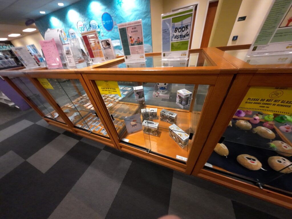 その奥に大きな児童コーナーがある。ここはジェリー・ブロードウェル児童室と呼ばれている。地域に貢献のあった人物の名前である。児童コーナーには Vox Books や PLAYWAY のオーディオブック,学習用タブレットがあり,特に VoxBook は人気が高いという。展示ケースでは,市民による子ども向け展示が行われている。「子ども向け」であることを条件に自由に展示できる。アヒルの人形,アメリカンフットボールの選手カード,キティちゃんのぬいぐるみなど,自由な感じの展示である。